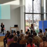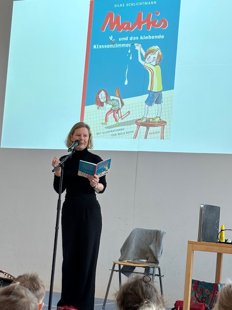 Sie las aus dem Buch Mattis und das klebende Klassenzimmer vor, zeigte wundervolle Zeichnungen von Maja Bohn und sang mit den Kindern zwei Lieder über Mattis und seine Geschichte. „Ich heiße Mattis Hansen. Ich bin acht Jahre alt. Und meine Mutter glaubt, ich werde ein Schwerverbrecher.“So startet Mattis Geschichte diesmal, obwohl er eigentlich nur seiner besten Freundin Kathi helfen möchte…