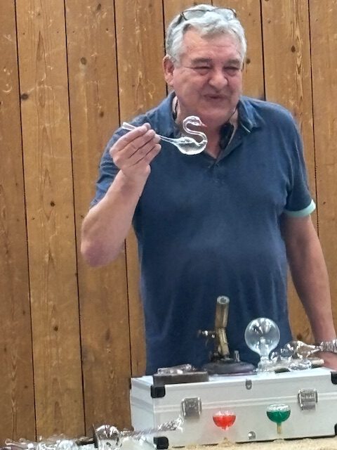 Neben einigen Objekten wie einem Schwan und einer Vase für Rosen und einem Spaßvogel (der Wasser spritzte), die er vor den Augen der Kinder geblasen und bearbeitet hat, vermittelte er ihnen auch Wissen. Woraus besteht Glas, war seine Frage?